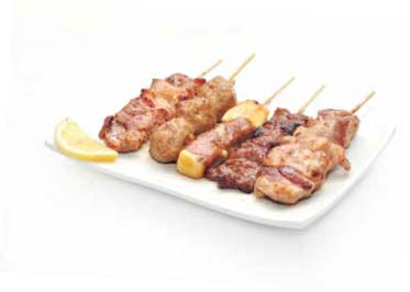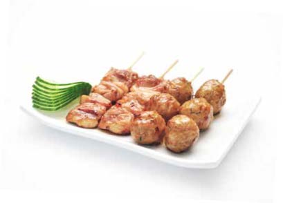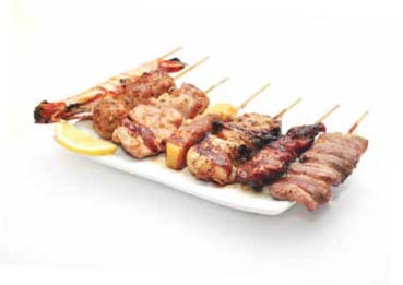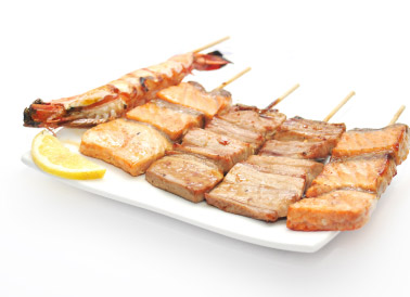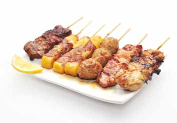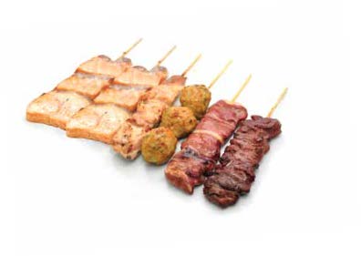 Salade, soupe, riz 7 brochettes : 1 boeuf, 1 poulet, 1 boeuf au fromage, 1 boulette de poulet , 1 gambas, 1 canard 1 aile de poulet